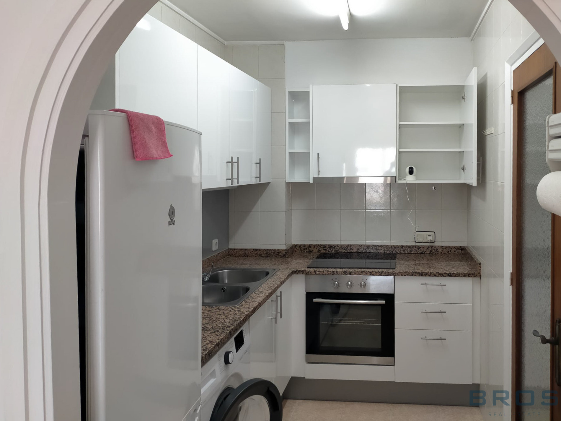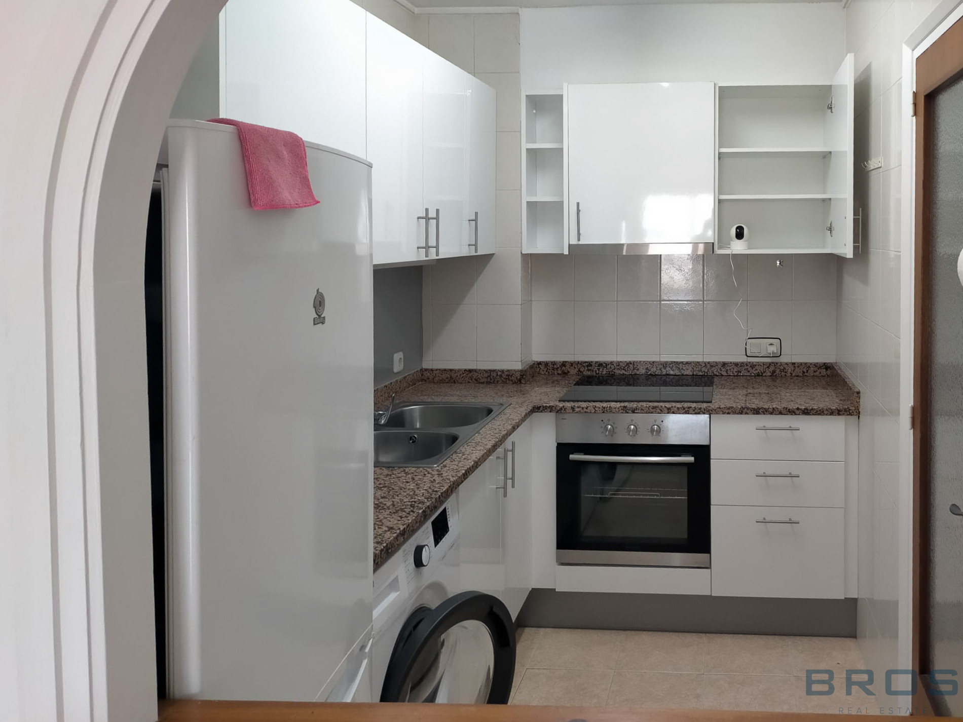 La cocina es abierta y cuenta con pasaplatos hacia el salón, lo que aporta mayor amplitud y funcionalidad al espacio.