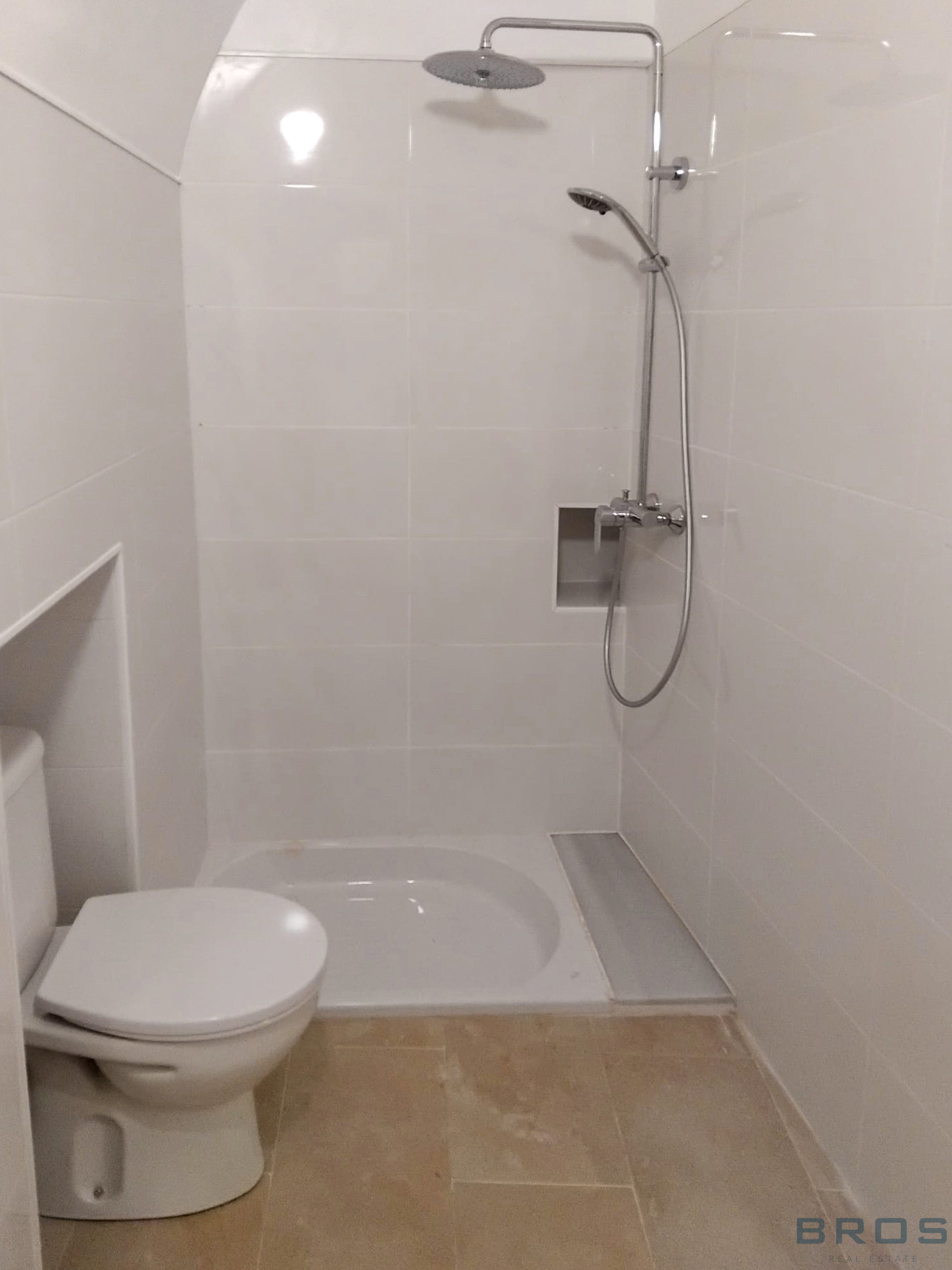 La cocina, abierta al espacio principal, conserva elementos rústicos como el dintel de piedra, generando un ambiente con personalidad. La vivienda dispone de un baño totalmente reformado, con ducha amplia y grifería moderna, además de un elegante mueble de baño con iluminación LED integrada.