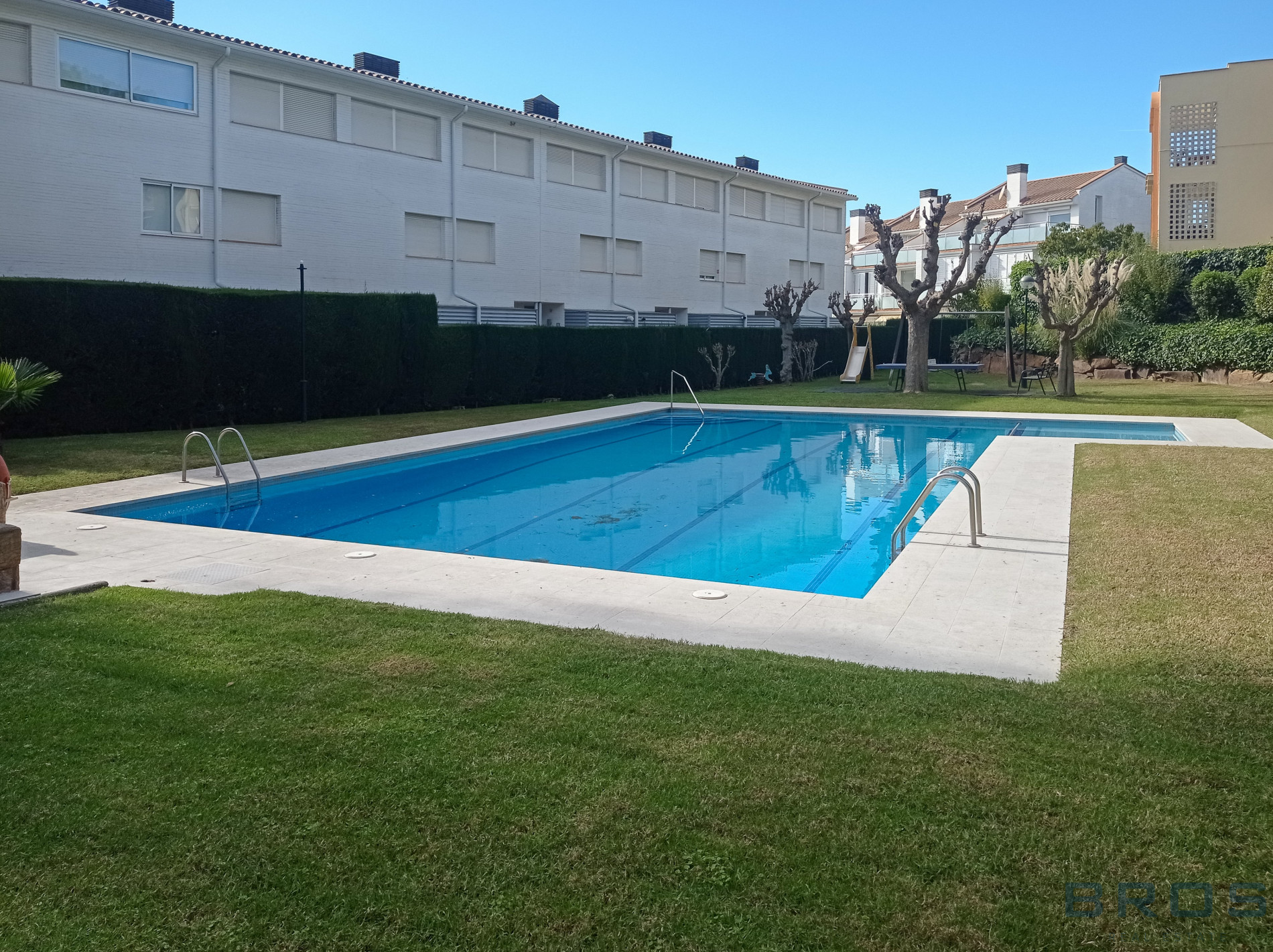 En la calle Tramuntana de S’Agaro, en un edificio construido en el año 1980 que se ha rehabilitado recientemente y que dispone con una zona comunitaria ajardinada con piscina y zona de juegos.